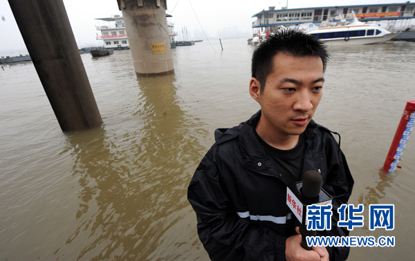 7月13日,一名記者在武漢關(guān)水文站前作現(xiàn)場(chǎng)報(bào)道。當(dāng)日,長(zhǎng)江武漢關(guān)水位上漲26.15米,超設(shè)防1.15米。受持續(xù)強(qiáng)降雨影響,長(zhǎng)江流域多處發(fā)生超警戒洪水,中下游干流各站水位繼續(xù)上漲。新華社記者 余國(guó)慶 攝