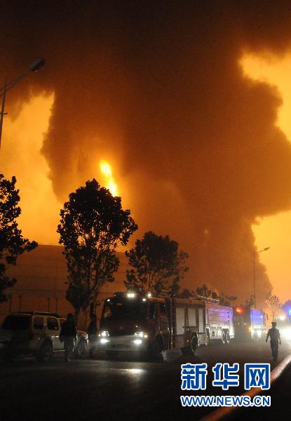 消防官兵在爆炸現場滅火(7月16日攝)。 7月16日晚18時許,大連市大連新港附近中石油的一條輸油管道發生爆炸起火。到當晚23時30分記者發稿時,火勢得到初步控制。 新華社記者蔡擁軍 攝