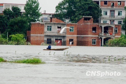 自7月8日21時開始,江西樂平市普降大到暴雨,平均降雨量160毫米,局部地區達250毫米,強降雨導致該市浯口鎮產生了嚴重內澇災害,相鄰的程家墩、楊溪、桃園三村處在一片汪洋之中,成為了“孤島”。 中新社發 朱定文 攝
