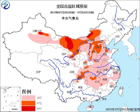 預計,今天白天,甘肅大部、青海東北部、寧夏中北部、內蒙古中西部、陜西關中地區和東部、山西、河北大部、京津地區、河南大部、山東中西部、安徽中北部、湖北、四川盆地東部、重慶、貴州東北部、湖南大部、江西中北部、浙江大部、福建北部、海南北部等地有35~37℃的高溫天氣,其中,甘肅中西部、內蒙古中西部、山西東部等地的局部地區最高氣溫可達40℃以上。
