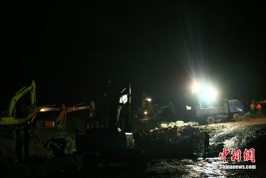 8月14日凌晨,汶川境內(nèi)映秀鎮(zhèn)、漩口鎮(zhèn)、銀杏鄉(xiāng)、三江鄉(xiāng)等鄉(xiāng)鎮(zhèn)發(fā)生多處泥石流災(zāi)害,泥石流阻斷道路、沖毀房屋,泥石流沖出物致使120米寬的岷江河道淤塞,堰塞體平均高度達(dá)7米,致使岷江改道。圖為工程人員正在連夜處置堰塞體。中新社發(fā) 張浪 攝