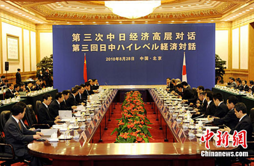 8月28日,第三次中日經濟高層對話在北京人民大會堂舉行。中國國務院副總理王岐山、日本外相岡田克也等出席。中新社記者 劉震 攝