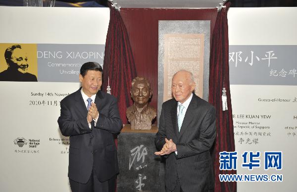 11月14日,正在新加坡訪問的國家副主席習(xí)近平與新加坡內(nèi)閣資政李光耀共同出席在新加坡河畔舉行的鄧小平紀(jì)念碑揭幕儀式。新華社記者黃敬文攝