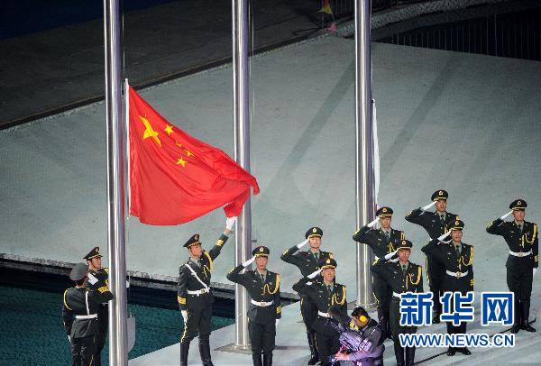 11月27日,第16屆亞運會閉幕式在廣州市海心沙島舉行。這是閉幕式上的升國旗儀式。 新華社記者郭勇攝