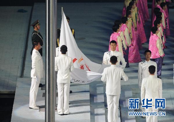 11月27日,亞奧理事會會旗在閉幕式上緩緩降落。當日,第16屆亞運會閉幕式在廣州市海心沙島舉行。 新華社記者李勇攝