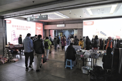 1月6日,國貿(mào)站通往銀泰商場的通道,兩旁的攤位使通道縮窄一半。