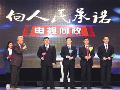 3月27日,南寧電視問政節目現場,四位官員手拿問政代表送上的蒼蠅拍。