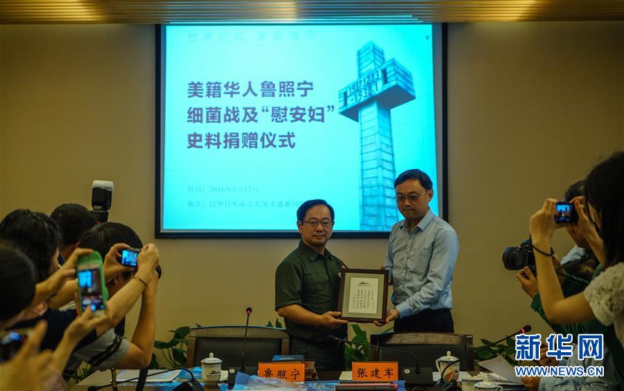 5月12日,在侵華日軍南京大屠殺遇難同胞紀念館,館長張建軍向魯照寧(左)頒發捐贈證書。記者當日從侵華日軍南京大屠殺遇難同胞紀念館獲悉,該館最新獲贈173件反映侵華日軍在中國使用化學武器和研制細菌武器、強征“慰安婦”等方面的史料,包含美國國家檔案館和美國軍事部解密的部分文件、照片,來自侵華日軍私人相冊的“慰安婦”歷史照片等。據了解,這批史料均由美籍華人魯照寧捐贈。2004年以來,他已先后12次向該館捐贈實物、史料等超過1500件。 新華社記者 李響 攝