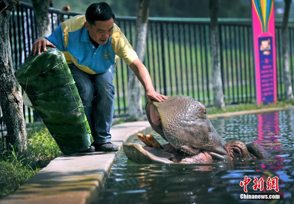 每到端午,家家戶戶忙著買粽葉、包粽子,一時間粽葉幽青、糯米飄香。端午節,重慶永川一野生動物園的動物們也嘗到了粽子的美味。圖為為了給河馬吃上粽子,飼養員費盡了心思。這只巨粽,用了一斤多粽葉。鐘欣 攝