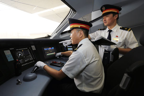 王小衛(右一)正在指導動車組司機掌握平穩精準操縱技巧