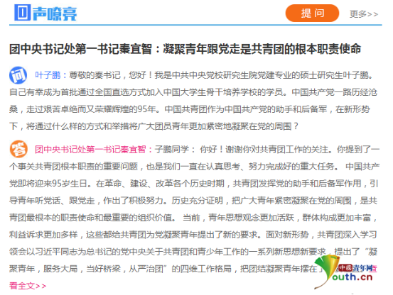 團中央書記處第一書記秦宜智通過“青年之聲”回答中共中央黨校研究生葉子鵬的提問。網頁截圖
