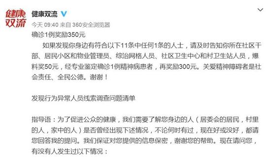 消息稱,如果發(fā)現(xiàn)身邊有符合以下11條中任何1條的人士,請(qǐng)及時(shí)告知所在社區(qū)干部、居民小區(qū)和物業(yè)管理員、綜治網(wǎng)格人員、社區(qū)衛(wèi)生中心和村衛(wèi)生站人員,爆料獎(jiǎng)50元。如果經(jīng)專業(yè)鑒定確診1例精神病患者,再獎(jiǎng)勵(lì)300元。
