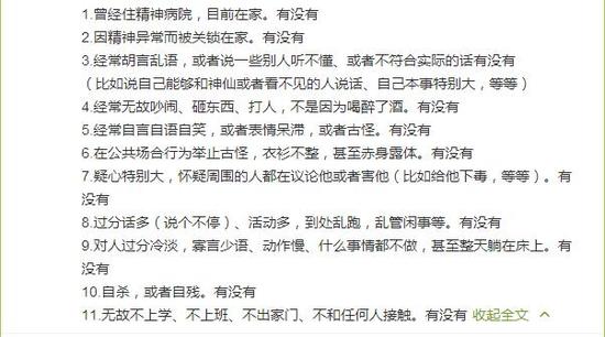 所謂的11條,即判斷對(duì)方是否曾經(jīng)有下述11種情況出現(xiàn):曾經(jīng)住精神病院,目前在家;因精神異常而被關(guān)鎖在家;經(jīng)常胡言亂語(yǔ),或者說(shuō)一些別人聽不 懂、或者不符合實(shí)際的話(比如說(shuō)自己能夠和神仙或者看不見的人說(shuō)話、自己本事特別大,等等);經(jīng)常無(wú)故吵鬧、砸東西、打人,不是因?yàn)楹茸砹司疲唤?jīng)常自言自 語(yǔ)自笑,或者表情呆滯,或者古怪;在公共場(chǎng)合行為舉止古怪,衣衫不整,甚至赤身露體有沒(méi)有;疑心特別大,懷疑周圍的人都在議論他或者害他(比如給他下毒, 等等);過(guò)分話多(說(shuō)個(gè)不停)、活動(dòng)多,到處亂跑,亂管閑事等;對(duì)人過(guò)分冷淡,寡言少語(yǔ)、動(dòng)作慢、什么事情都不做,甚至整天躺在床上;自殺,或者自殘;無(wú) 故不上學(xué)、不上班、不出家門、不和任何人接觸。
