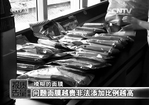 廣東省食藥監(jiān)局工作人員經(jīng)過(guò)檢驗(yàn),有33個(gè)面膜樣品檢出非法添加了糖皮質(zhì)激素。本版圖片/央視視頻截圖