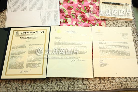 這次與王成漢見面,瑪麗還帶來了一份特殊的禮物。它們是來自美國駐中國大使館的大使馬克斯·西本·鮑克斯(Max Sieben Baucus)和州參議院主席斯蒂芬·斯威尼(Stephen Sweeney)的公告與禮物;一些當年被從濰縣集中營解救出來的難民寫給王先生的感謝信;美國代表唐納德·諾克羅斯(U.S. Rep Donald Norcross)也因王先生的“無私的行為與貢獻”將其姓名寫進了國會記錄,旣悓⑦@些信件親手交到王成漢手中,兩位老人戴上老花鏡,認認真真地翻看起來。王成漢用顫抖的手指撫摸著這些信件,忍不住輕輕讀出了聲。