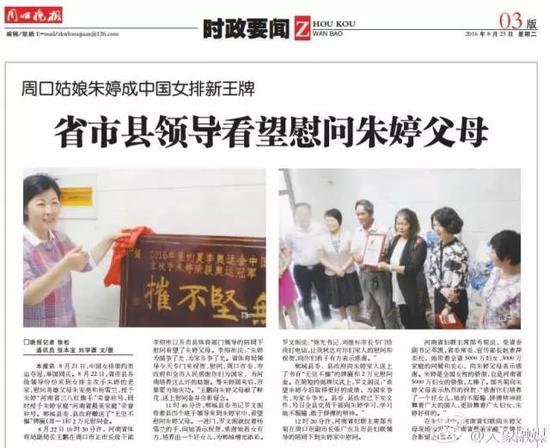 在中國女排獲得奧運(yùn)冠軍后,朱婷的家人也迎來了各方的看望和祝賀。《周口晚報(bào)》23日就刊發(fā)了新聞《省市縣領(lǐng)導(dǎo)看望慰問朱婷父母》。