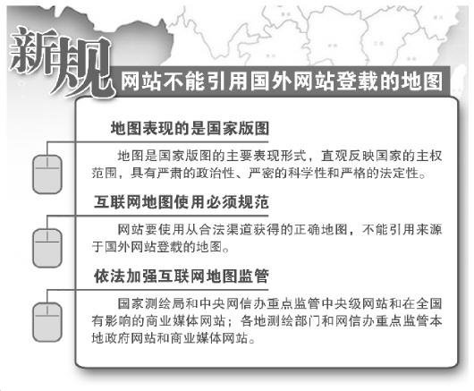 兩部門要求,各互聯(lián)網(wǎng)服務(wù)單位要嚴(yán)格按照《測(cè)繪法》、《地圖管理?xiàng)l例》等法律法規(guī)進(jìn)行地圖審核和登載使用。地圖在登載前應(yīng)依法送審,不得在地圖上標(biāo)注涉密信息或者違反我國(guó)民族政策及政治主張的內(nèi)容。