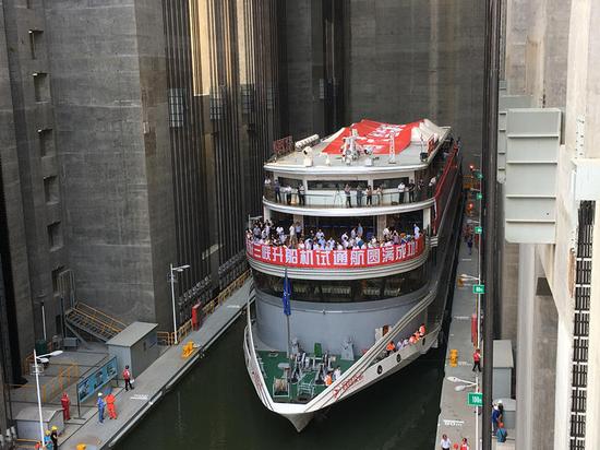 9月18日,“長江三峽9號”游輪駛離升船機進入下游引航道。新華社記者 程敏 攝