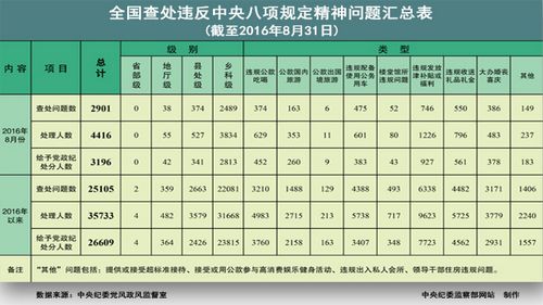 數據顯示,2016年8月全國查處違反中央八項規定精神問題2901起,處理4416人。其中鄉科級干部違反中央八項規定精神問題比較嚴重,達到2489件。另外,“違規發放津補貼或福利”情況最為嚴重,達到746件。