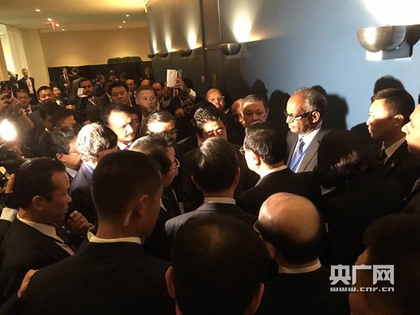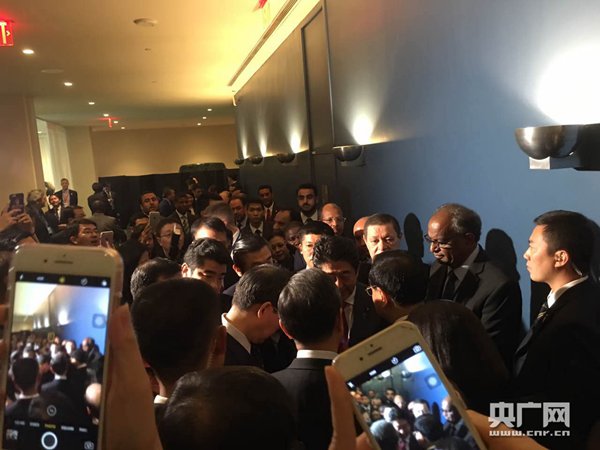 原標題:安倍在聯大會場外過道處與李克強握手交談