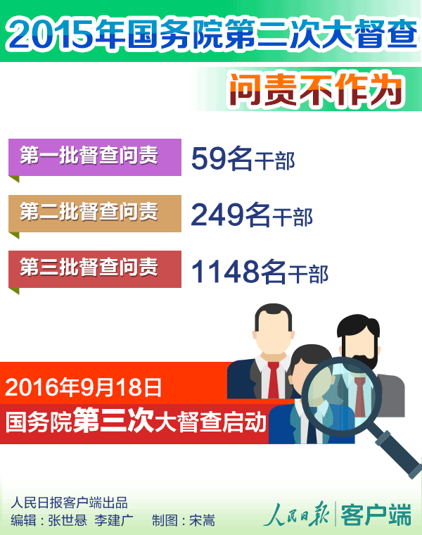 2015年,國務院第二次大督查首次對行政不作為進行了問責,7個省的59名干部受到處分。之后,在跟蹤審計和專項督查的基礎上,還連續開展了兩批督查問責,相繼有1397名干部因庸政懶政怠政和不作為被相關地方嚴肅問責。今年9月18日,國務院啟動第三次大督查,20個督查組分赴各地各部門,“為官不為”再次成為督查的重點。(完)