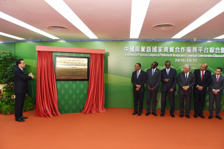 開幕式前,李克強(qiáng)同與會葡語國家領(lǐng)導(dǎo)人共同出席“中國與葡語國家商貿(mào)合作服務(wù)平臺綜合體”項(xiàng)目啟動儀式,并為“平臺綜合體”項(xiàng)目揭牌。
