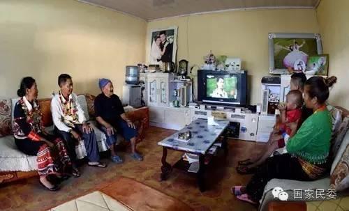 在三臺山鄉允欠村,德昂族群眾在新裝修的客廳內看電視。