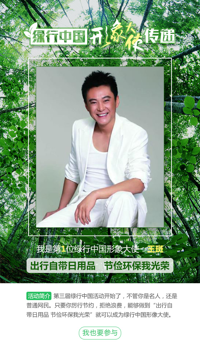 而作為本屆活動的最大亮點,綠行中國首次聘請國家一級演員王斑擔任形象大使,發(fā)揮了名人效應,讓綠色環(huán)保家喻戶曉。王斑與妻子曹穎都通過微博轉(zhuǎn)發(fā)了綠行中國的活動報道,并呼吁:讓我們從小事做起,從自我做起,“綠行中國”功在當下,利在千秋,出行自帶日用品,節(jié)儉環(huán)保我光榮。煙臺最美女孩刁娜也參與其中,在微信中呼吁踐行綠色環(huán)保。在他們的號召和帶動下,近200名網(wǎng)友紛紛參與,爭當形象大使,厲行節(jié)約,拒絕浪費。