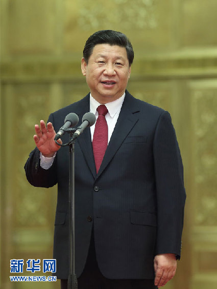 2014年1月6日,黨和國家領(lǐng)導(dǎo)人習(xí)近平、李克強(qiáng)、張德江、俞正聲、劉云山、王岐山、張高麗等在北京人民大會堂會見探月工程嫦娥三號任務(wù)參研參試人員代表。這是習(xí)近平發(fā)表重要講話。新華社記者 蘭紅光 攝