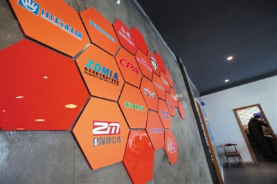 2015年12月8日,烏鎮鎮金融咖啡館內的一面墻上,貼滿了互聯網企業機構的標志。新京報記者 李冬 攝