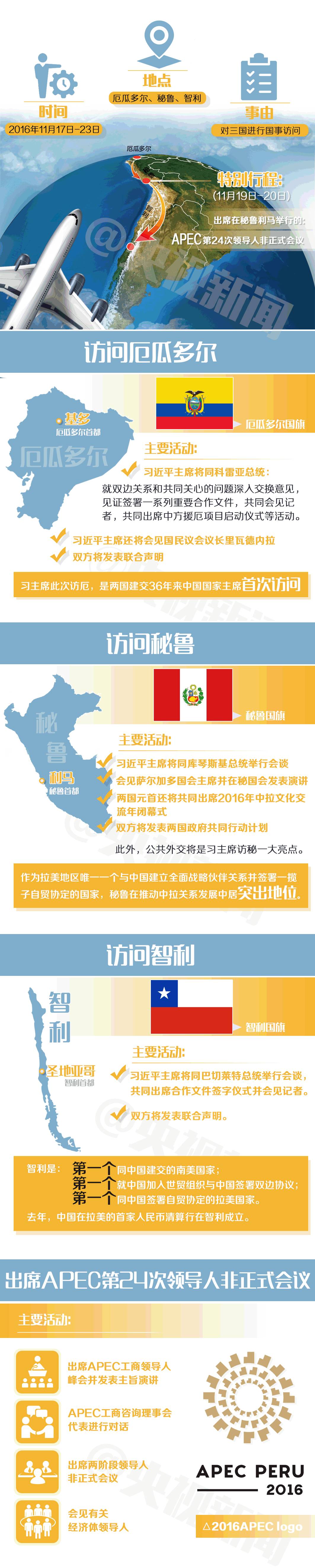 11月16日,國家主席習(xí)近平乘專機(jī)離開北京,對厄瓜多爾、秘魯、智利進(jìn)行國事訪問并出席在秘魯利馬舉行的亞太經(jīng)合組織第二十四次領(lǐng)導(dǎo)人非正式會議。這是習(xí)主席第三次訪問拉美國家。