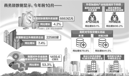 全球貿(mào)易增速放緩,中國引資“答卷”亮點(diǎn)依舊。11月17日,商務(wù)部發(fā)布最新數(shù)據(jù)顯示,今年前10月,不含銀行、證券、保險(xiǎn)領(lǐng)域數(shù)據(jù),我國實(shí)際使用外資金額6663億元,同比增長4.2%;全國新設(shè)立外商投資企業(yè)22580家,同比增長7.4%;我國對外非金融類直接投資累計(jì)投資額1459.6億美元,同比增長53.3%。