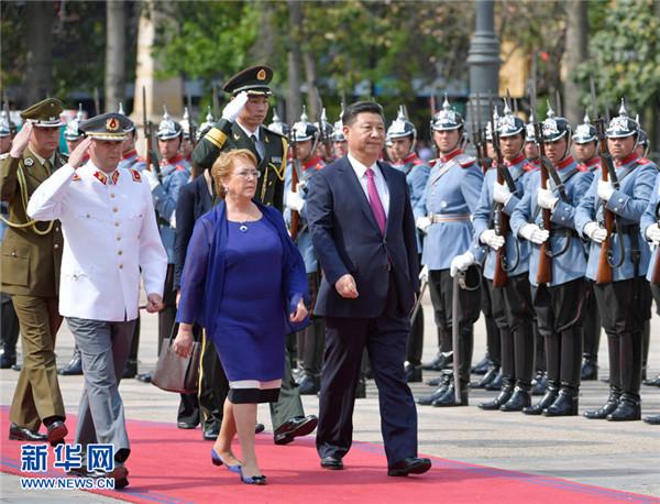 11月22日,國(guó)家主席習(xí)近平在圣地亞哥同智利總統(tǒng)巴切萊特舉行會(huì)談。這是會(huì)談前,習(xí)近平出席巴切萊特在憲法廣場(chǎng)舉行的隆重歡迎儀式。新華社記者 王曄 攝