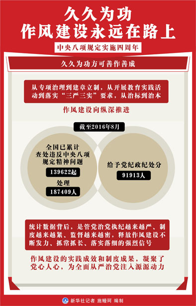 遏制“舌尖上的浪費(fèi)”、剎住“車輪上的腐敗”、整治“會(huì)所里的歪風(fēng)”……中央八項(xiàng)規(guī)定實(shí)施4年來(lái),黨風(fēng)政風(fēng)、社風(fēng)民風(fēng)發(fā)生了一系列實(shí)實(shí)在在的改變。截至2016年8月31日,全國(guó)累計(jì)查處違反八項(xiàng)規(guī)定精神問(wèn)題139622起,處理187409人,給予黨紀(jì)政紀(jì)處分91913人。從查出違紀(jì)問(wèn)題類型來(lái)看,其中“違規(guī)配備和使用公車”26172起,“違規(guī)發(fā)放津補(bǔ)貼或福利”13826起,“大辦婚喪喜慶”12934起,“違規(guī)收送禮品禮金”11015起,“違規(guī)公款吃喝”9978起,“公款國(guó)內(nèi)旅游”4861起,“樓堂館所違規(guī)”1520起,“公款出國(guó)旅游”578起。