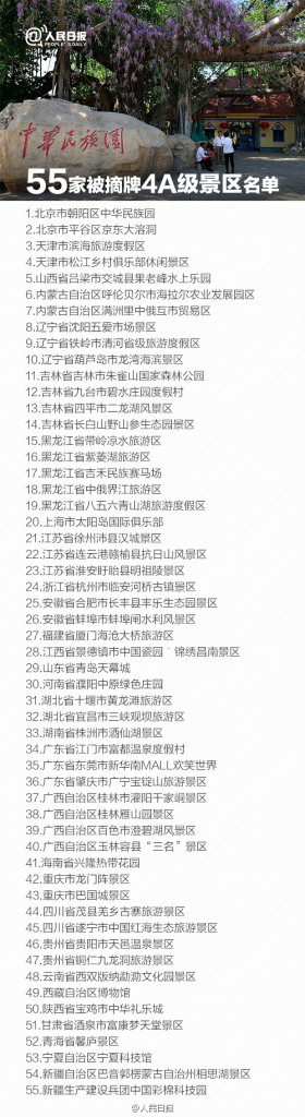 人民日報記者王珂消息,國家旅游局今日通報,截至目前,全國31個省區市均已完成對本地4A級及以下景區檢查,共有367家4A級及以下景區受到不同程度處理。其中,107家A級景區被摘牌,包括55家4A級景區,黑龍江5家、吉林、廣西各4家、遼寧、江蘇、廣東各3家。