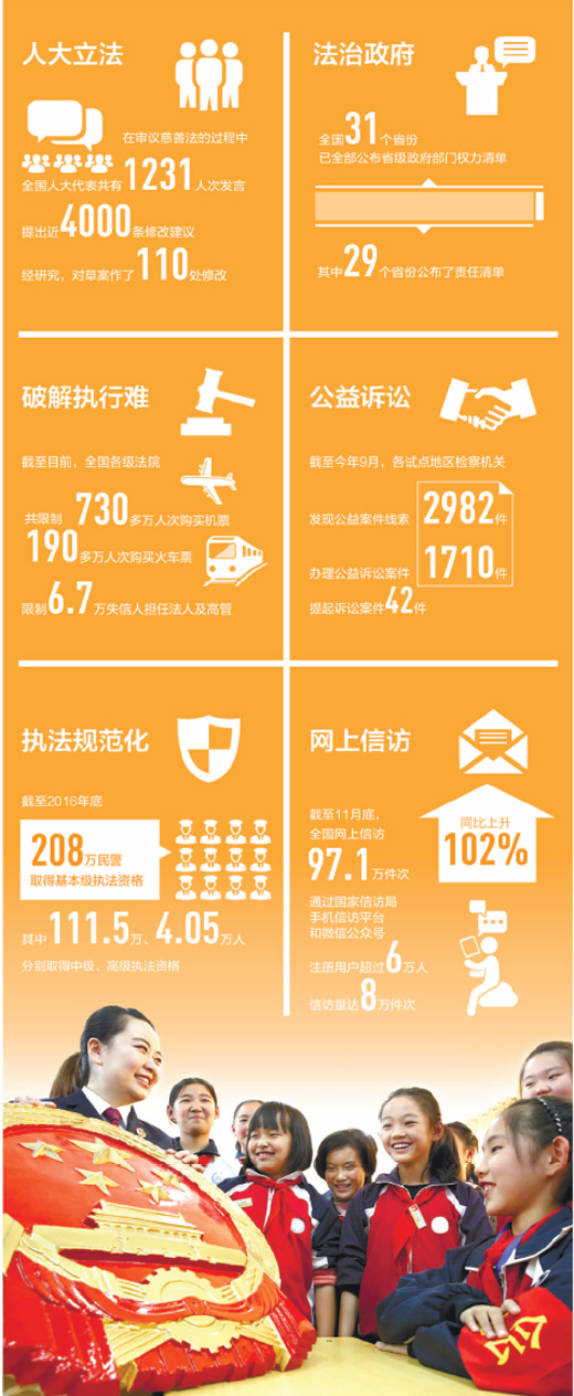 2016年,一共有35部法律獲得通過,其中修改25部,新制定10部。人民群眾的關切和期待在哪里,立法修法的關注點就在哪里。立法機關努力使每一項立法都能成為一道保護人民群眾合法利益的重要力量。