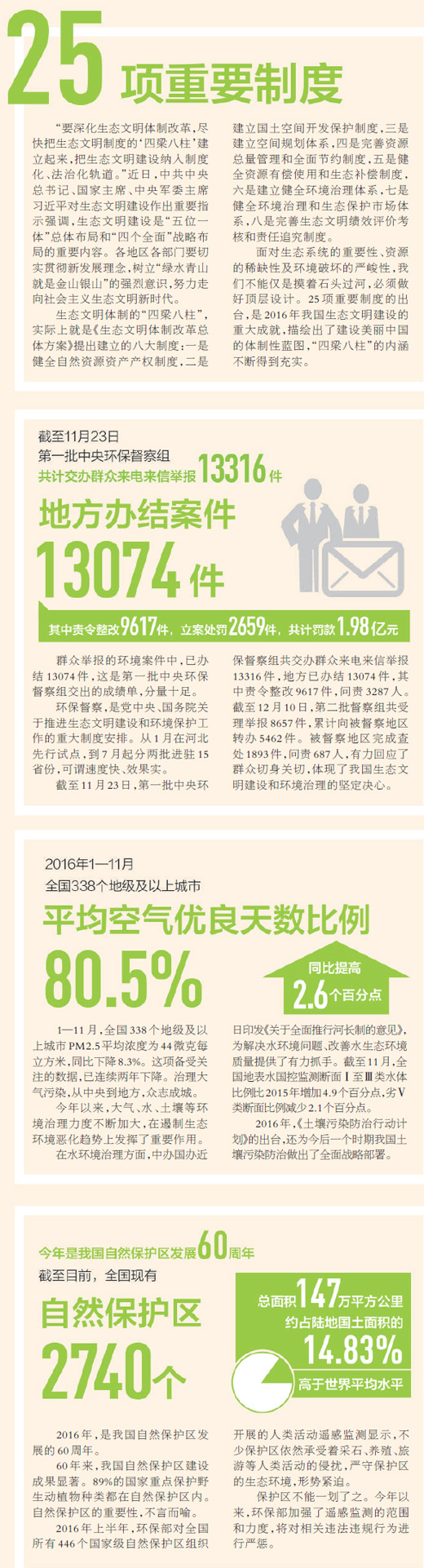 盤點2016年生態環保領域大事,令人振奮。從中央環保督察制度形成到省以下環保機構垂直管理試點,從國家生態文明試驗區試點到生態環境損害賠償制度試點,生態文明制度建設已經按下快進鍵,改革步伐加快,成果有目共睹。
