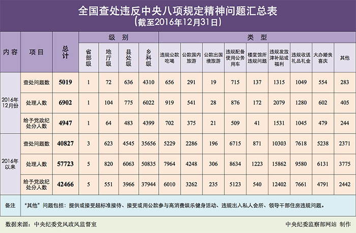 為掌握全國貫徹落實中央八項規(guī)定精神情況,中央紀(jì)委在31個省區(qū)市和新疆生產(chǎn)建設(shè)兵團、139個中央和國家機關(guān)、102個中央企業(yè)、15個中央金融企業(yè)建立了落實中央八項規(guī)定精神情況月報制度。2016年以來,截至12月31日,全國查處違反中央八項規(guī)定精神問題情況如下: