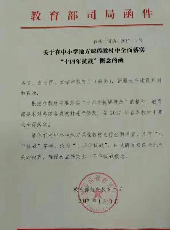 《函件》表示,根據(jù)在教材中要落實“十四年抗戰(zhàn)概念”的精神,教育部要求對各級各類教材進行修改,在2017年春季教材中全面落實。