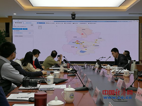 天津市環(huán)保局工作人員在進(jìn)行操作演示,向采訪團講解地圖上的行政區(qū)劃與治污網(wǎng)格一一對應(yīng)。(中國經(jīng)濟網(wǎng)記者范戴芫 攝)
