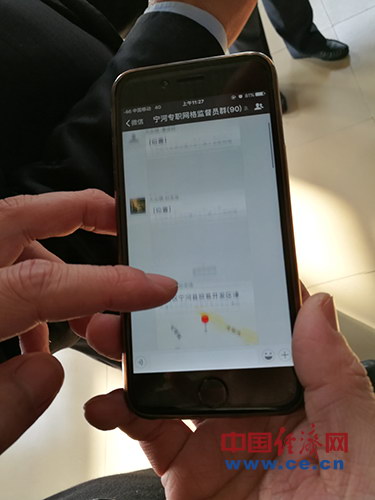 寧河區(qū)清新空氣行動指揮部辦公室負(fù)責(zé)人陳建洋向記者展示群里網(wǎng)格員發(fā)送的坐標(biāo)定位。(中國經(jīng)濟網(wǎng)記者范戴芫 攝)