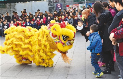 2月9日,在廣東省佛山市禪城區祖廟內的黃飛鴻紀念館,醒獅團隊為前來觀光的游客獻上精彩的舞獅表演,帶來新春祝福,喜迎元宵佳節。圖為醒獅表演者在現場與游客互動。