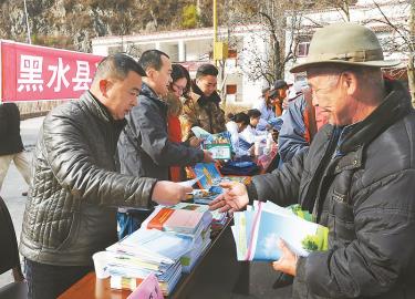 黑水縣工作人員為村民發(fā)放種養(yǎng)類科技讀物。圖片由 何才華 史雨 本報(bào)記者 徐中成 攝