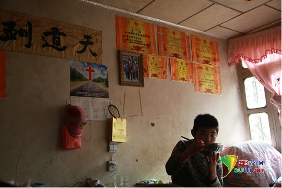 李治平家中的墻壁上掛著其子李云波的獎狀,李治平稱,還有很多獎狀在震后重蓋房屋時弄丟了。中國青年網記者 孫釗 攝