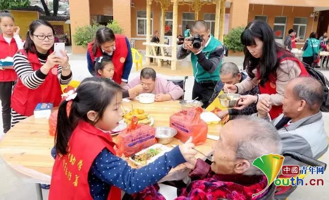 劉天明帶領小欖中小學學生給敬老院老人們喂飯、敬老。本人供圖