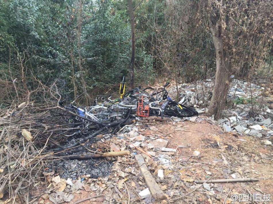 有成都市民報(bào)料,稱(chēng)2月25日下午在成都市三圣鄉(xiāng)某農(nóng)家樂(lè)對(duì)面一停車(chē)場(chǎng),發(fā)現(xiàn)多輛被破壞的共享單車(chē)。記者來(lái)到三圣鄉(xiāng),并找到了位于“梅林山莊”對(duì)面的停車(chē)場(chǎng)。在停車(chē)場(chǎng)左側(cè)一土溝里,記者發(fā)現(xiàn)了被破壞的共享單車(chē)。