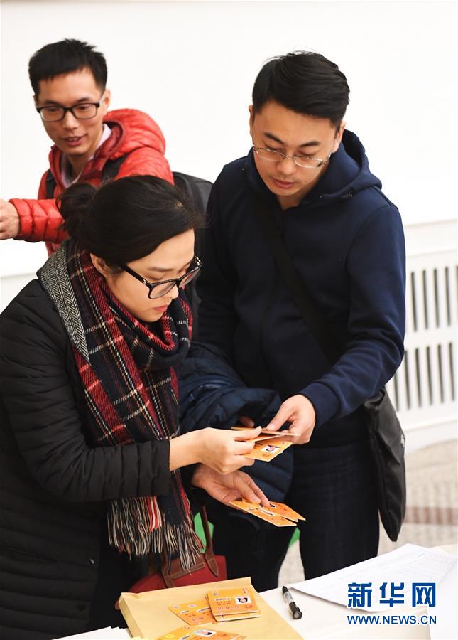 3月1日,在北京人民大會(huì)堂澳門廳,參加十二屆全國(guó)人大五次會(huì)議采訪報(bào)道的記者領(lǐng)取證件。 新華社記者趙穎全攝