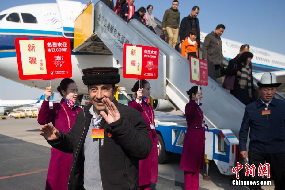 3月2日,參加十二屆全國人大五次會議的新疆代表團乘飛機抵達北京首都國際機場。中新社記者 泱波 攝