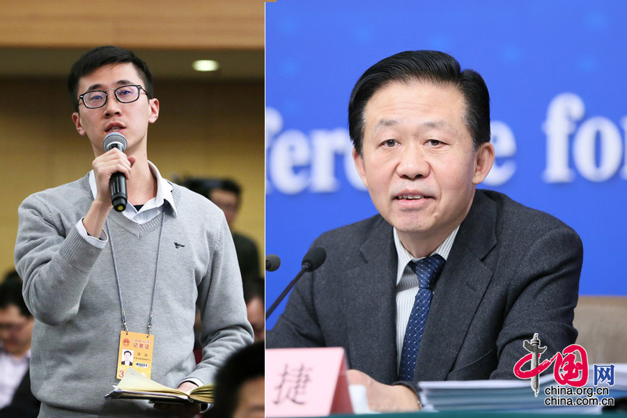 中國網(wǎng)記者向財(cái)政部部長肖捷提問。中國網(wǎng) 高聰攝影