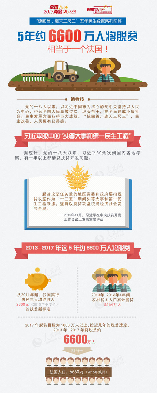 2013-2017年,這5年我國(guó)約6600萬(wàn)人將要脫貧。貧困發(fā)生率從10.2%下降到4.5%。“原來(lái)靠吃野菜填肚子,現(xiàn)在頓頓都有油水!”“去年,家里各種收入有7萬(wàn)多塊錢,人均差不多8000多塊。”“今年手頭寬松了!”“看來(lái)今年過(guò)了個(gè)‘肥年’啊!”……